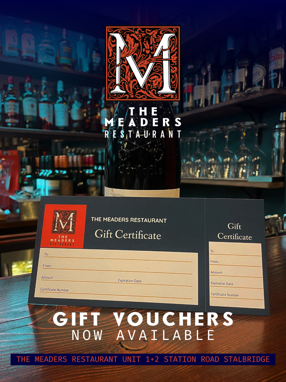 Gift vouchers are now available at The Meaders Restaurant. Treat your loved ones, colleagues and friends to a night out at our lovely new restaurant.