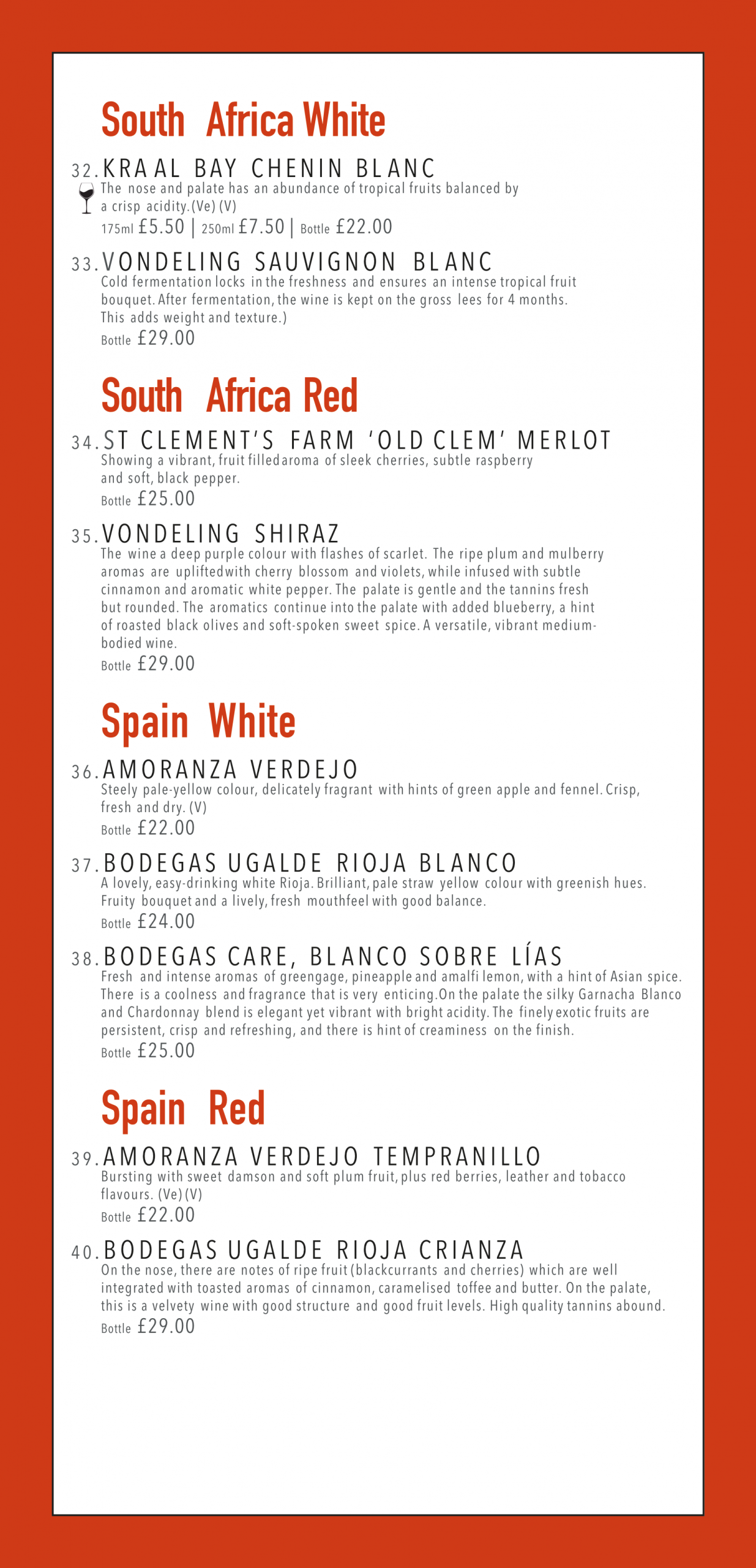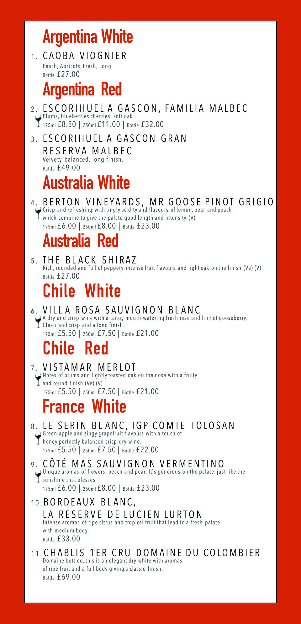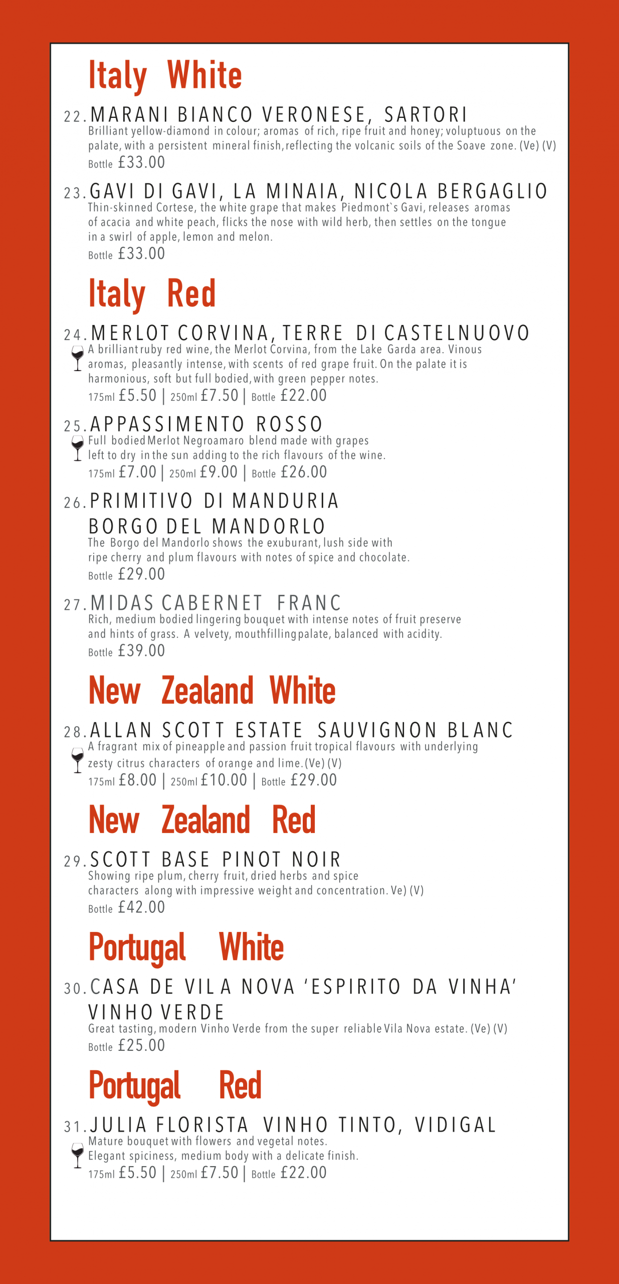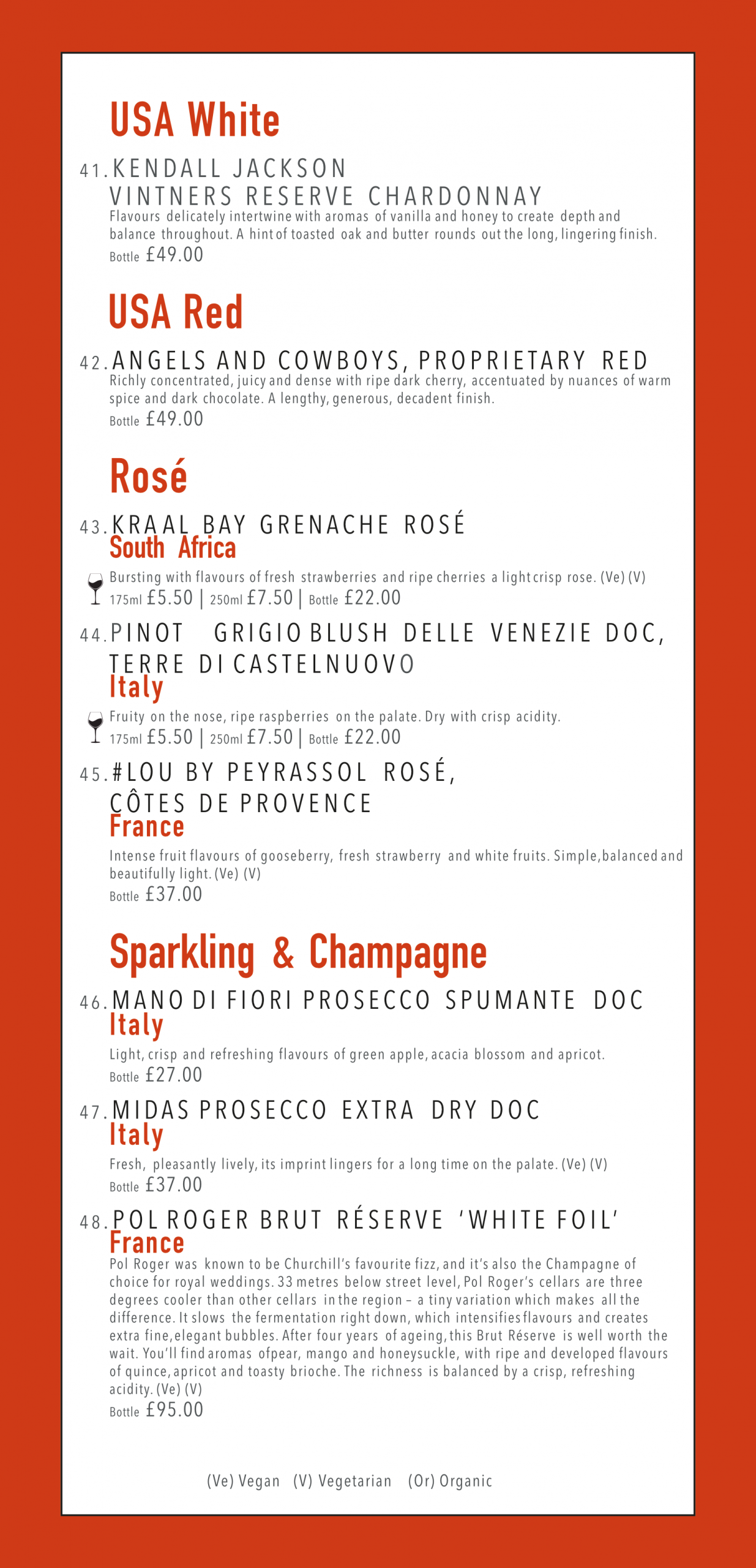 175ml £6.00 | 250ml £8.00 | Bottle £23.00